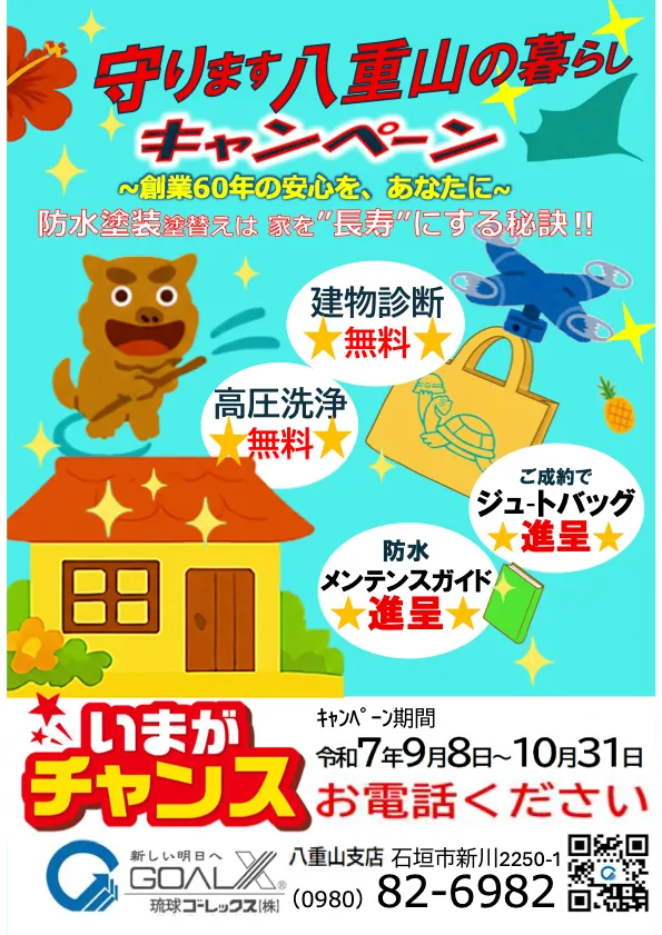 琉球ゴーレックスでは、八重山の暮らしを守る取り組みとして、防水塗装・塗替えでお住まいを“長寿”にするための特別キャンペーンを実施中です。